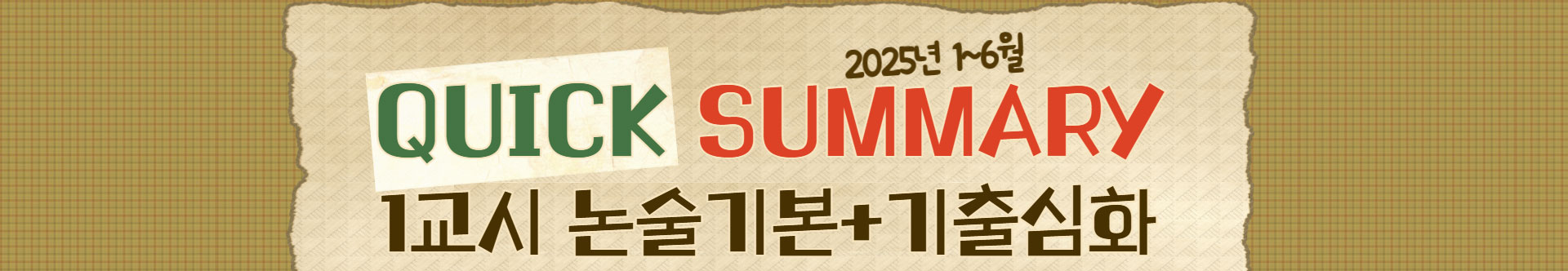 | | 강의구성 | 접수기간 | 수강기간 및 배수 | 수강료 | 2025 Quick Summary (1~6월 과정) | 1교시 논술기본(기본이론+초보논술+미니모고+최신정책) (1~4월) | 2025년 09월 30일까지 | 2025년 11월 22일까지 1.2배수 | 580,000 → 201,000 (65%할인) | 1교시 기출심화(심화이론+기출변형3/4모의고사+현장형 문제) (5~6월) | 2025년 09월 30일까지 | 2025년 11월 22일까지 1.2배수 | 280,000 → 98,000 (65%할인) | · 상품구성 및 수강관련 안내 - Quick Summary 강의의 수강기간은 2025년 11월 22일까지입니다. - 첨삭 미제공(종강 후 시일이 많이 지난 관계로 첨삭은 제공되지 않습니다. ) - 일시중지 및 수강기간 연장이 불가능합니다. - 본 상품은 제휴 할인등과 중복적용되지 않습니다.